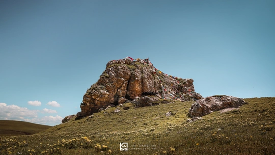 孤岩披挂千幡,猎猎声破绿野沉寂。蓝是天的底色,彩是地的祷词,风裹挟经诵拂过草甸,在石壁刻下光的密语。