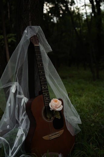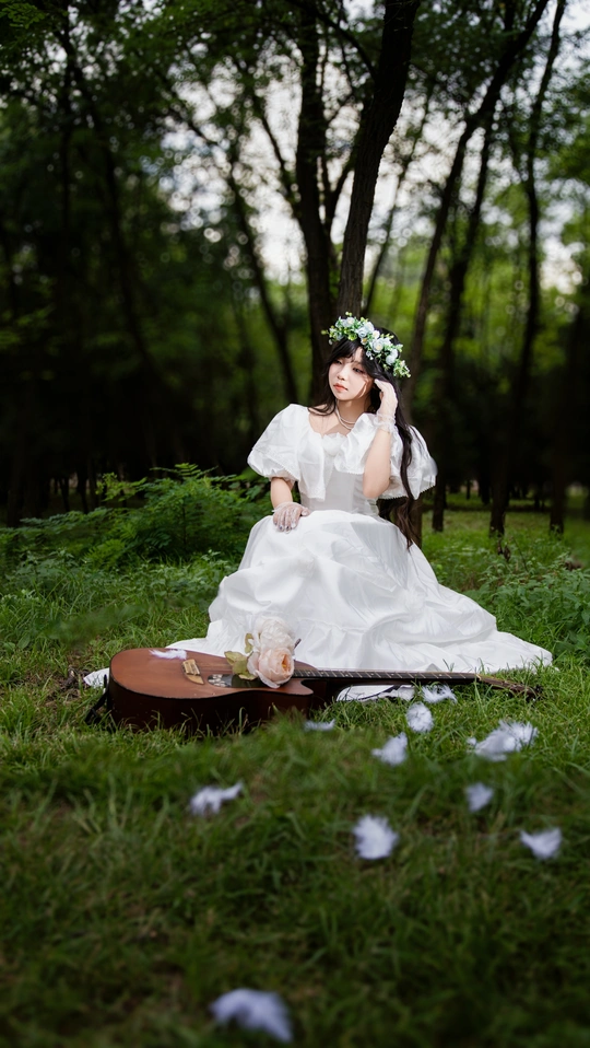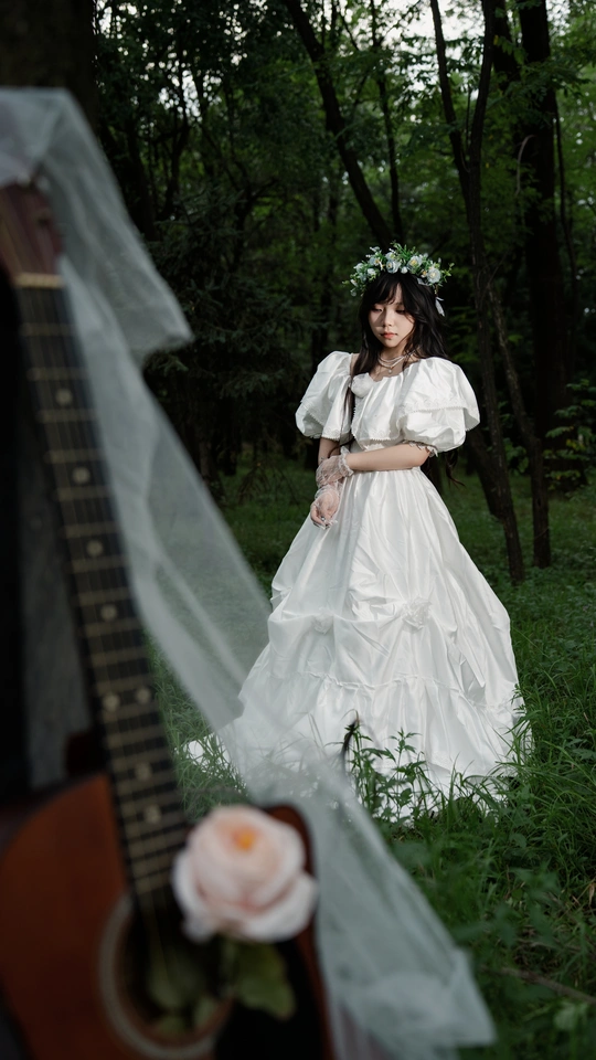 当森林的褶皱里藏进黄昏,白裙便成了流动的月光。 吉他披着薄纱,像被岁月摩挲出温度的老友,那朵浅粉的花,是它与自然合奏时扬起的音符。 她站在树影斑驳处,花冠是自然递来的「婚戒」,将山野的浪漫,郑重戴在肩头。指尖曾无数次在琴弦上追逐风声,此刻吉他静静相伴,把成长里借旋律抒发的迷茫、对纯粹热爱的执着,都揉进这一方静谧——原来「嫁」的不只是某段情愫,是与相伴多年的热爱,完成一场不问归期的奔赴。 在森林的见证里,她嫁给了那个,敢把灵魂系在琴弦、敞向荒野的自己 。