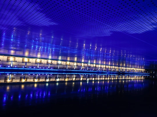 在通往盐城欧风花街的桥下通道里是一处油画画廊,这里被称之为“世界名桥长廊”,墙上摆满了世界各大名桥的油画或照片。夜晚时分,行人长廊靠水边的灯带亮起了蓝色的光,映照在水面上反射出一片幽蓝,又与头顶(桥底)的蓝色天花板遥相呼应,呈现出一个蓝调世界,非常的漂亮。