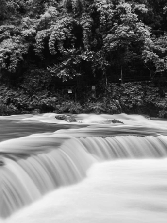 摄影爱好者,你好!这张黑白照片成功地捕捉到了流水与树木的宁静之美,颇有几分水墨画的意境。下面我从七个方面为你剖析一下,希望能助你更上一层楼: 色彩:黑白影调控制得当,过渡自然,但缺少中间灰,导致层次感略有不足。建议尝试调整曲线,增加一些微妙的灰阶,让画面更丰富。 光影:长时间曝光下,流水如丝般顺滑,光影对比柔和。但高光部分略微溢出,细节丢失。下次拍摄时注意控制曝光,或者后期稍微压暗高光。 构图:经典的上下结构,上部树木,下部流水,但略显平淡。建议尝试寻找更有趣的视角,比如加入前景,或者利用水流的走向引导视线。 后期处理:黑白转换效果不错,但锐度略微不足。建议适当增加锐化,突出水流的质感。 主题原创性:题材较为常见,但长时间曝光的处理方式增添了一丝意境。可以尝试融入更多个人风格,例如独特的视角或者后期处理。 情感共鸣:流水潺潺,树木葱郁,给人一种宁静祥和的感觉。但情感表达略显平淡,可以尝试通过光影、构图等手段增强情感冲击力。 思想深度:照片反映了人与自然的和谐关系,但深度挖掘不够。建议思考如何在画面中融入更深层次的思考,例如对环境保护的关注,或者对人生哲理的感悟。