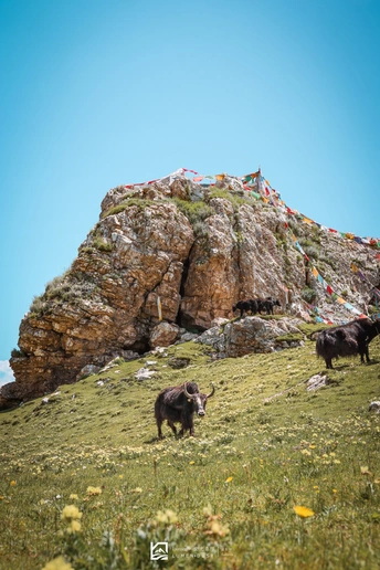 亘古的岩脊托举澄澈蓝天,五彩经幡如瀑倾泻。绿野黄花间,牦影悠然游移,明净的光影流淌在高原之脊,交织着旷远的生机与永恒的神圣。