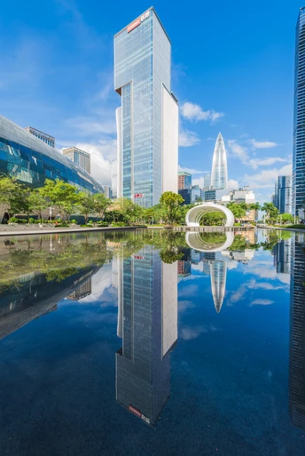 晴朗的天气,深圳联想后海总部大厦,水面倒影对称的构图拍下此作品。