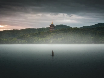 在清晨的鸟鸣中,拍到了三潭映月与雷峰塔的梦幻同框