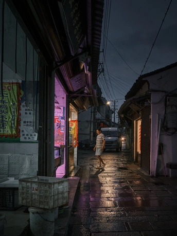 这张照片捕捉到了雨后小巷的独特氛围,颇具意境。我们来逐一分析: 色彩:整体色调偏冷,紫色霓虹灯与潮湿地面的反光形成视觉焦点。色彩搭配和谐,但略显单调,可以尝试在后期中稍微调整色彩平衡,突出环境的细节。 光影:光线主要来自店铺和远处的灯光,在地面形成湿漉漉的反光,增加了空间感。但是,主体人物的光线略显不足,影响了视觉中心的突出。建议尝试使用反光板或闪光灯补光,突出人物。 构图:采用中心构图,小巷的纵深感引导视线。但画面元素稍显杂乱,例如左侧的杂物略微分散注意力。可以尝试调整拍摄角度,简化画面元素。 后期处理:后期处理效果不错,整体色调统一。但需要注意细节的处理,例如降噪和锐化,避免出现噪点和过度锐化的情况。 主题原创性:照片展现了雨后小巷的市井生活气息,具有一定的原创性。但主题表达略显含蓄,可以尝试通过更生动的瞬间捕捉,强化主题。 情感共鸣:照片营造出一种安静、略带忧郁的氛围,容易引起观者的情感共鸣。但情感的表达可以更强烈,例如捕捉人物的表情或动作,增强故事性。 思想深度:照片反映了城市生活的一角,具有一定的社会意义。但思想深度可以更深入,例如关注城市发展与传统文化的冲突与