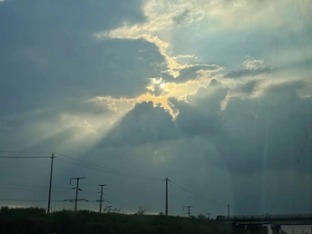 这幅作品展现了天空中壮观的光影景象。厚重云层间,阳光穿透缝隙洒落,形成放射状光束。地面可见电线杆、电线与桥梁,植被覆盖的地表增添生机,整体营造出自然光影交织、静谧又磅礴的氛围,呈现出一种独特的户外风景之美 。