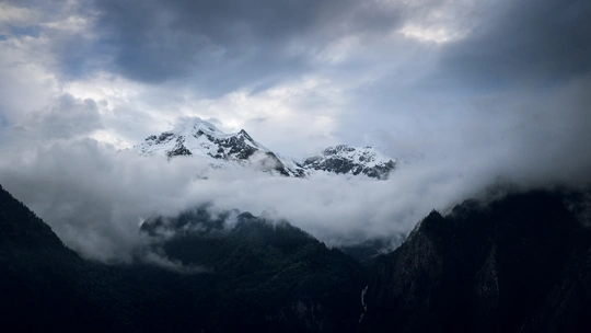 苍茫云海间,雪峰如神祇垂首,皑皑冠冕刺破苍穹。山脊是大地绷紧的肌腱,在雾霭中勾勒出冷峻的折痕,而低垂的层云正以泼墨之姿漫过群峦。这是亘古的沉默博弈——永恒之白凝视流转之灰,坚硬岩骨缠绕柔韧云纱。当风撕开片刻天光,雪山显露出冰封的诗行:那是时间以冰川为笔,在天地卷轴上书写的磅礴偈语 拍摄设备:佳能r62