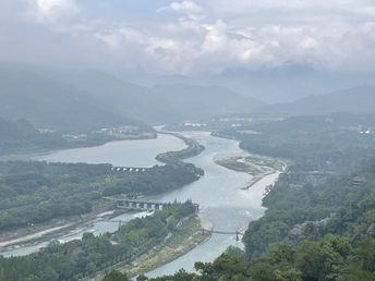 俯瞰都江堰,岷江如练,在苍翠群山与葱郁植被间蜿蜒。鱼嘴分水堤巧妙分流,飞沙堰吞波吐浪,宝瓶口束水成瀑,千年古堰水利奇观尽显,山水交融间,满是古人智慧与自然灵韵 。