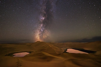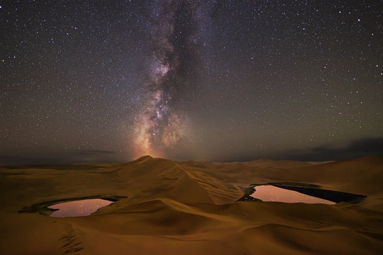 广袤沙漠在夜色中铺展,金黄沙丘如大地的脊梁起伏。两汪湖水似镜面,揽尽银河璀璨与繁星闪烁。头顶,银河如发光丝带倾泻而下,繁星密布成网,荒芜沙海与浩瀚星空相遇,静谧中藏着宇宙的磅礴,每一粒沙、每一颗星,都在诉说天地的永恒对话 。