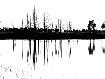 删繁就简,素影入水。枯树与倒影共织清寂,在黑白里,见天地,见自己 。