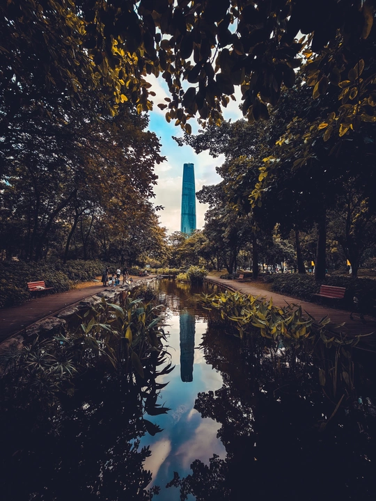 走进这里,心也随之沉静下来。看呐,那中央的小河,宛如大地深情的眼眸,清澈而又深邃。河水如同一块无瑕的翡翠,毫无保留地映照着头顶的蓝天、飘荡的云朵,还有四周那如诗如画的风景,倒影在水中交织、晕染,像是大自然精心绘制的水彩画。河畔的树木,像是一群忠诚的守护者,它们在时光里悄然变换着色彩。夏日的翠绿还未完全褪去,秋的金黄已迫不及待地晕染开来,在阳光的照耀下,每一片叶子都像是跳动的音符,奏响着季节更迭的乐章。远处,那座现代化建筑宛如一位冷峻的巨人,以它独特的蓝色身姿,与这自然之景相互守望。它的倒影在波光粼粼的水面上摇曳生姿,仿佛是在与河水轻声诉说着城市的故事。沿着河岸漫步,木质步道在脚下延伸,那几张红色长椅,如同跳跃的火焰,为这宁静的画面增添了一抹温暖与浪漫。
