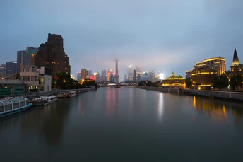 上海傍晚灯光初上云层下的外滩和陆家嘴夜景