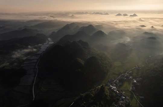 小山包,梯田,村庄。这就是晨雾云海中的安顺