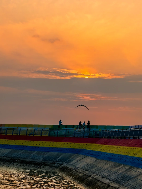 这幅图展现了一处黄昏时分的海滨景观。天空被橙黄色的晚霞浸染,太阳在云层后散发着柔和的光。下方是色彩斑斓的堤坝,红、黄、蓝等色彩相间,极具视觉冲击力。堤坝上有几个人的剪影,或驻足观赏,或拍照记录,一只飞鸟在他们上方的天空翱翔。水面波光粼粼,倒映着天空的颜色,整体画面充满了宁静而温暖的氛围感,人与自然的互动在这黄昏景致中显得格外和谐。