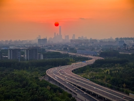 落日悬天,金辉漫路,将自然的壮丽与城市的呼吸,锁进雾霭。红阳、灰楼、金路,撞出雄浑韵律。