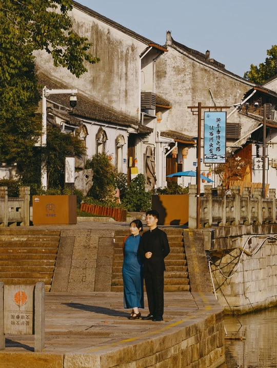 在西兴古镇游逛时,看到了一对情侣穿着中式服装在拍写真。杭州高达40°的高温,真的佩服他们!我离得远远的,开了10倍长焦,用手机蹭拍了几张。非常推荐西兴古镇,地方不大,但完整地保留了古建筑原貌,跟这边当地的老人聊天,他们告诉我这边几十年来几乎都没有什么变化,甚至这里很多老人都不会讲普通话,有种历史原汁原味复现的感觉。