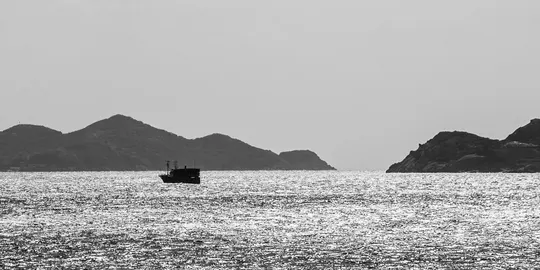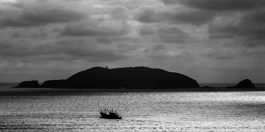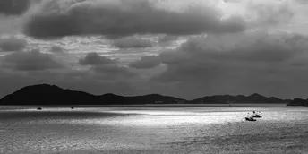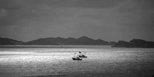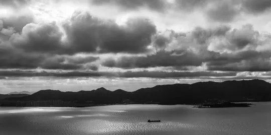 普陀山,这座佛教圣地,不仅有香烟缭绕的寺院,更有灵动的海上风光。 拍摄时,我被海天间的景象吸引,选择用黑白影像来呈现。 海面如镜,渔船或静泊,或缓缓航行,像是在与大海轻声对话。 远处的山峦轮廓分明,与天空中的云层交织,营造出静谧又深邃的氛围。 阳光穿透云层,在海面洒下粼粼波光,给黑白画面增添了独特的光影层次。 每一次按下快门,都是在捕捉普陀山大海的韵律与禅意,希望这些剪影能传递出这片海域的宁静与悠远。