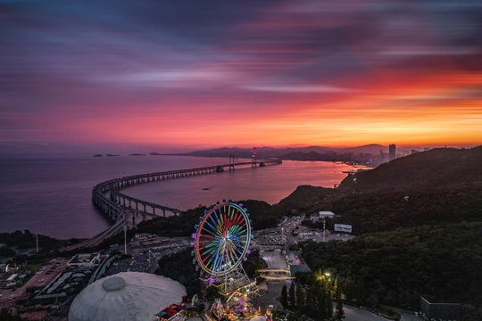 谁懂啊!在大连的傍晚,听着陈奕迅的《幸福摩天轮》,看一场晚霞,真的幸福感拉满~ 夕阳给天空晕染出粉紫、橙红的渐变,跨海大桥像一条银带,在波光粼粼的海面延伸。游乐园里的摩天轮彩灯闪烁,和晚霞同框,浪漫得像童话场景。 耳机里陈奕迅温柔的歌声响起,“当生命似流连在摩天轮,幸福处随时吻到星空”,感觉自己也跟着旋律,在这绚烂暮色里,慢慢升向幸福的云端啦~
