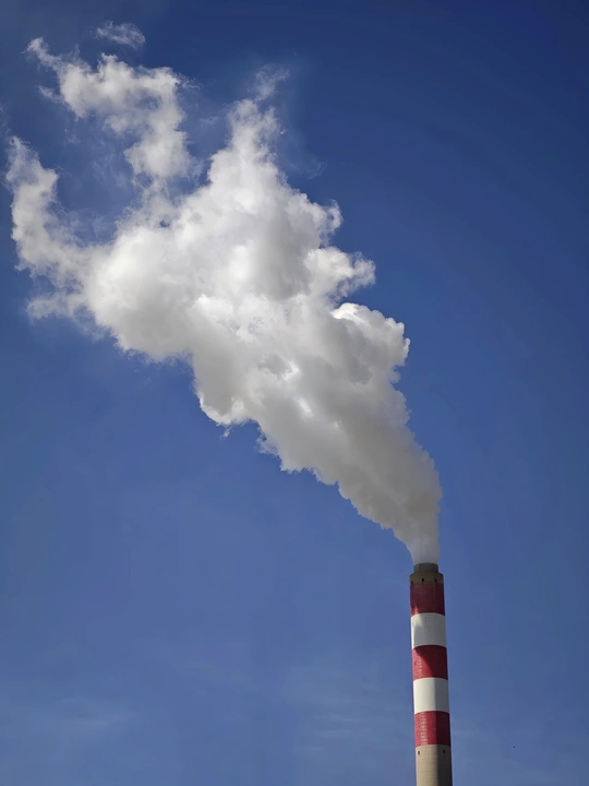 内蒙古电厂烟囱,冒出的白烟在蔚蓝的天空中如云朵一般。