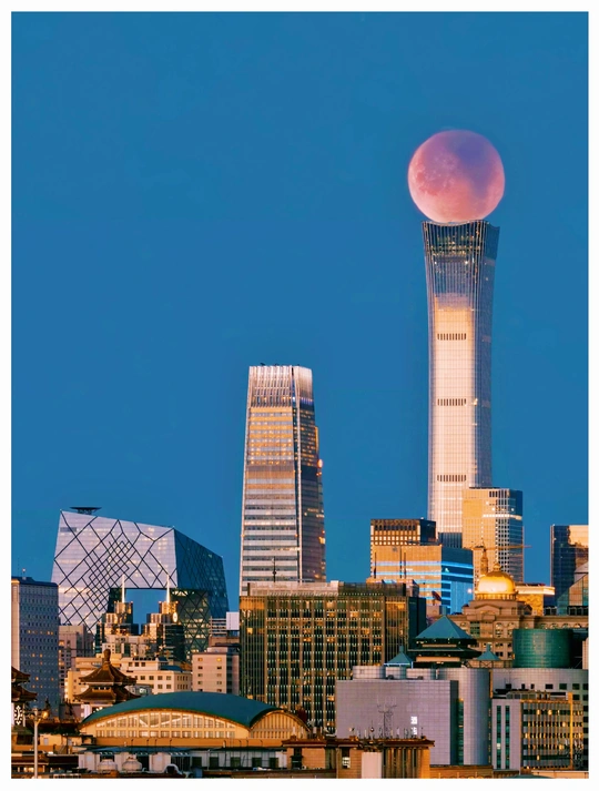 拍摄地点:北京昌平区白浮泉公园。 9月8凌晨出现血月,用vivo艺术月亮拍摄,当血月悬于中国尊之巅,古都北京的国贸CBD在暮色中尽显新韵。传统与现代在此碰撞,红月如诗,摩天楼似画,古老都城的历史底蕴与当代都市的蓬勃活力交融,勾勒出“你好北京”的独特篇章,诉说着一座城市在时光里的传承与跃迁。