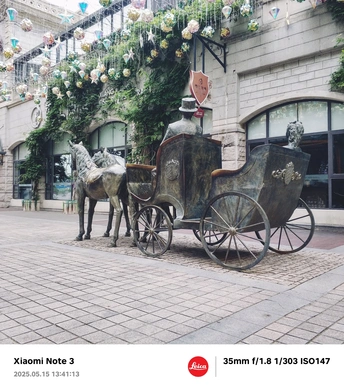 青铜质感的马车雕塑,给人一种以前的贵族才能乘坐的感觉,漂亮的盐城欧风花街。