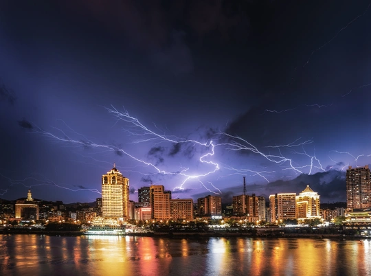 强对流袭击城市之后的几分钟,闪电在我眼前跳舞