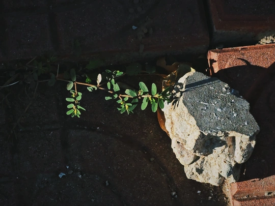 在砖石铺就的地面缝隙里,一株植物倔强生长。它的茎纤细却坚韧,努力延伸着,嫩绿的叶片小巧而精神,似在阳光下欢呼。旁边的石块粗糙厚重,本应是阻碍,却仿佛成了它的“守护者”,衬得这抹绿意愈发顽强,彰显出生命在困境中蓬勃的力量。