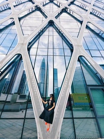 突出建筑的几何感与都市背景,同时体现人物穿搭的优雅气质。