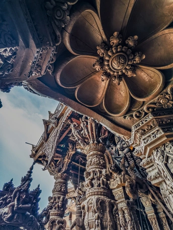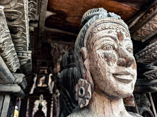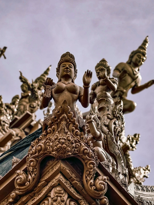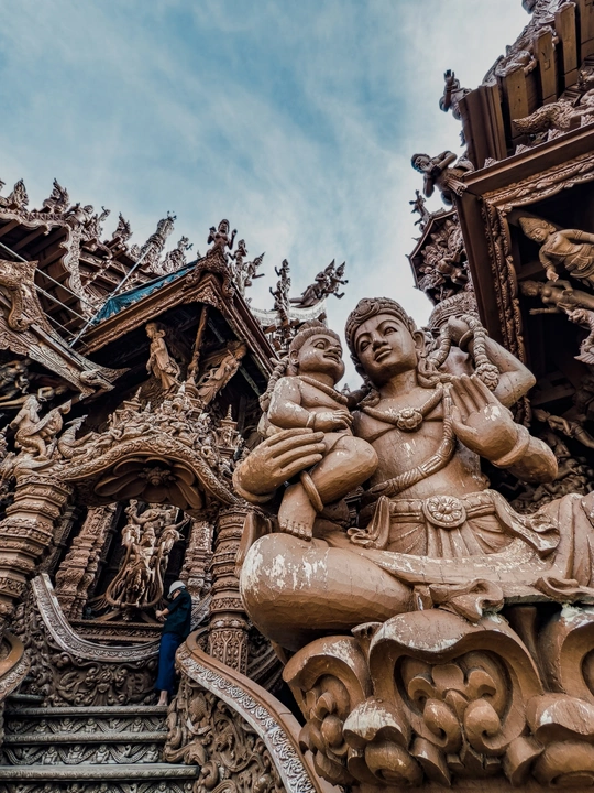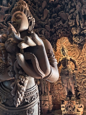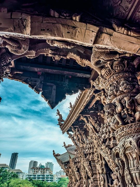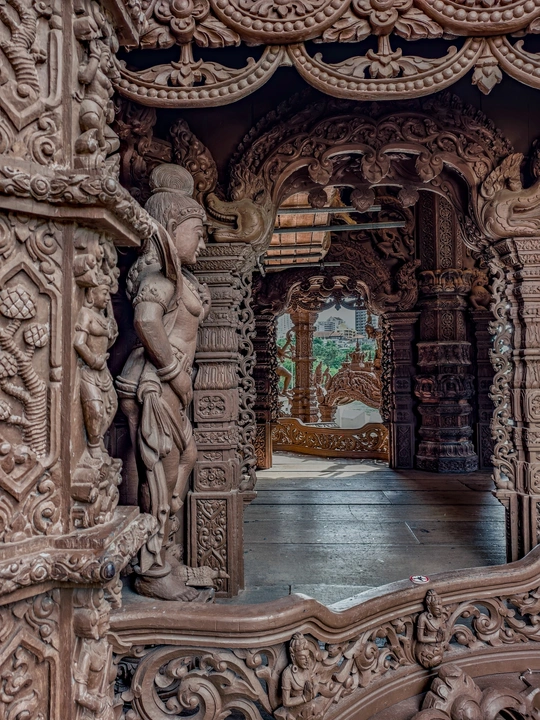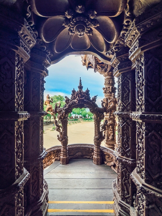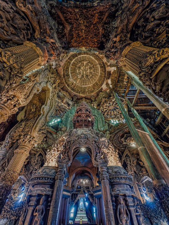 芭提雅真理寺, 可以列入人生必去清单的目的地,我说的。 始建于1981年,至今尚未修建完成。 整座建筑使用纯粹的红木和柚木作为原料,采用卡榫结构,没有一颗钉子,展现了泰国传统的木工技艺。 内部架构分为天堂、地狱、父系、母系、月亮、太阳和星星七大部分,蕴含着“我们是谁,我们来自哪里”等七大真理,展示了佛教、印度教等宗教与哲学思想。 港真,我走进去的时候, 真的有被震撼到。 怎么形容呢,这应该就是东方的圣家堂了。 photo by vivo x200pro over,么哒