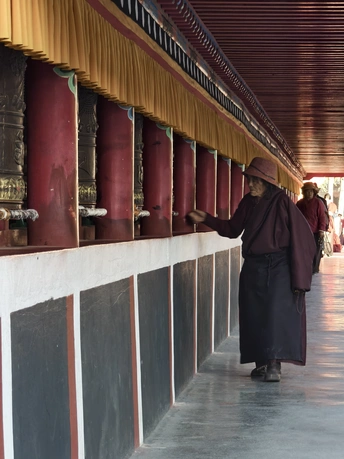 在古老的玛尼石堆下,一位身着传统藏袍的老人缓缓走过转经筒,手轻轻转动,仿佛在与时光对话。每一圈都是虔诚的祈愿,每一步都踏着信仰的足迹。