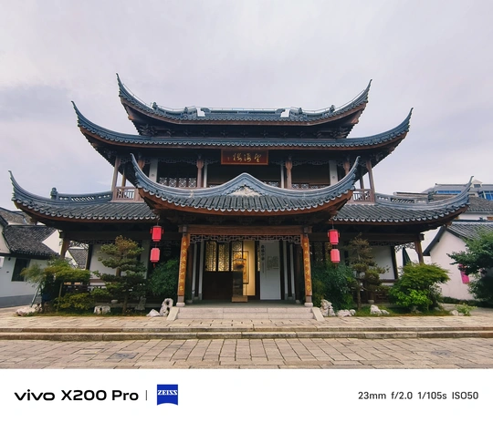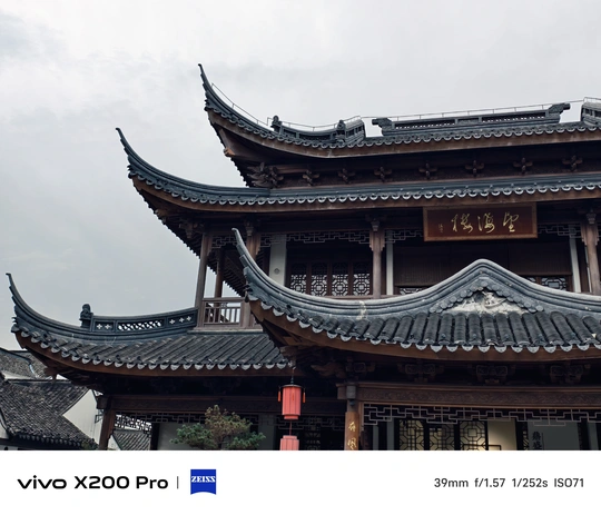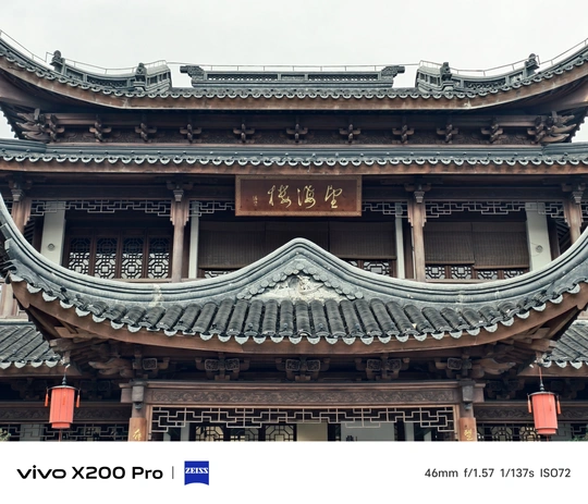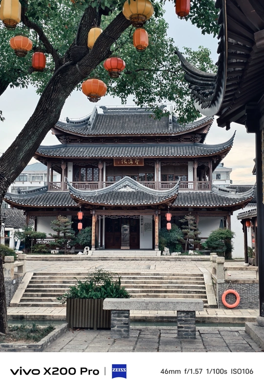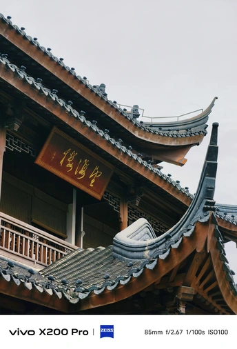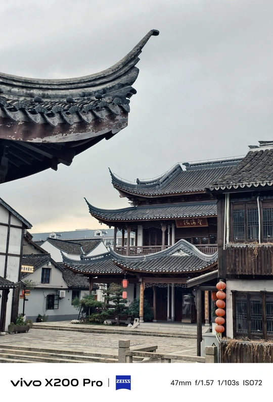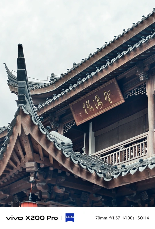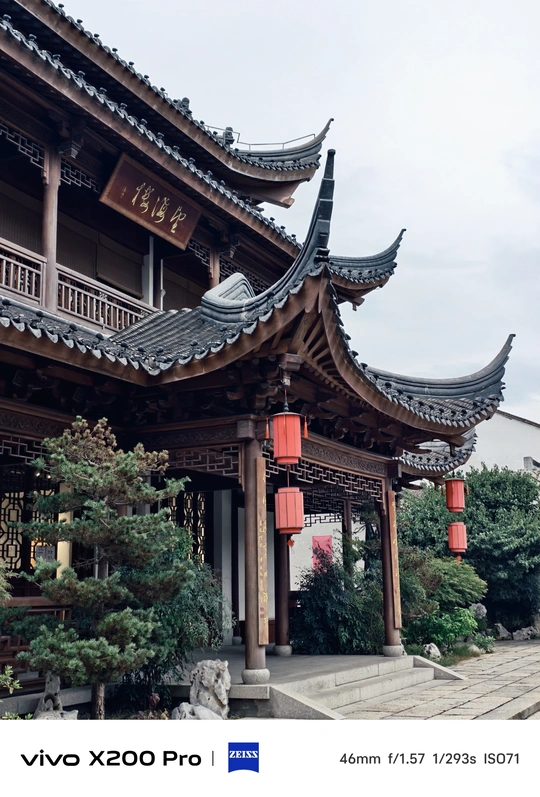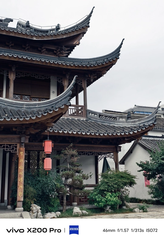 当我抬头看着望海楼,飞檐如振翅的鸥鸟,驮着千年风雨凌空欲飞,青灰色瓦片错落成诗,朱红廊柱撑起两层楼阁,“望海楼”匾额在风里泛着温润的光,似在无声诉说过往。 檐下红灯笼轻晃,光影在雕花木窗上织出细碎的梦。楼前松柏苍翠,山石错落,恍惚间,好似看见文人把酒临风,听涛观云,听见商贾笑语,惊落檐角铜铃。 现代喧嚣被抛在身后,唯有古意萦绕。当我融入这飞檐画栋,血脉里对传统的敬畏与热爱,已经悄然苏醒。