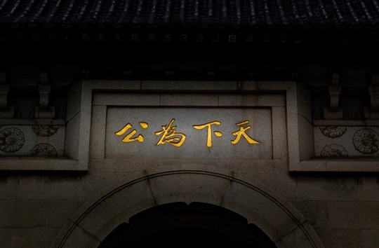 画面采用近景特写的构图方式,将刻有“天下为公”的石质匾额置于视觉中心,金色的字体在深色调的建筑背景衬托下,格外醒目且富有质感。上方的传统瓦当与建筑纹饰,传递出历史的沉淀感,下方的拱形结构则增添了画面的层次与纵深感,整体营造出一种肃穆、庄重的氛围。 “天下为公”本是孙中山先生三民主义的核心理念之一,作品通过对这一标识的聚焦,既展现了历史文化的传承,也如你所感,映射出当下国家对“公”之精神的践行——从社会治理的公平正义,到公共服务的普惠共享,都在诠释着“天下为公”在新时代的延续与发展,让观者在凝视画面时,能深切感受到这种跨越时空的理念传承与现实呼应。