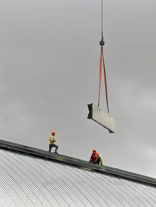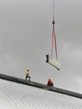 高空中建筑工人正在封顶,在阴沉天空中醒目。