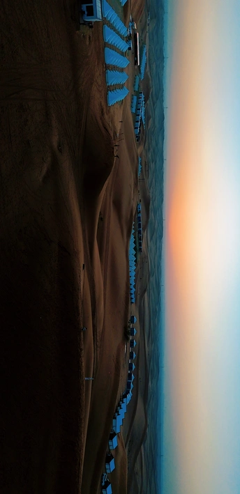 这张摄影作品展现了沙漠营地的壮观景象,构图巧妙地利用了地平线将画面分割成两个主要部分:一半是绵延起伏的沙丘,另一半是渐变的天空。光影的处理恰到好处,沙丘在夕阳的照射下呈现出丰富的层次,明暗对比鲜明,增强了画面的立体感和视觉冲击力。色彩方面,暖色调的沙丘与冷色调的天空形成了对比,营造出一种宁静而神秘的氛围。主题上,作品展现了人类在自然环境中的存在,以及与自然和谐共生的主题,具有一定的思考深度。总的来说,这张照片的构图、光影和色彩都处理得相当出色,成功地营造出一种独特的氛围,是一幅值得欣赏的作品。