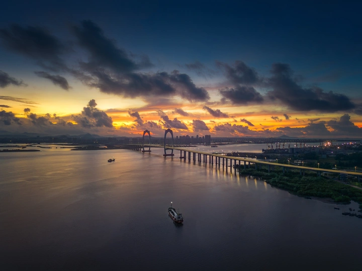 白昼的终章,于长桥之上奏响。暮色熔金,沉入靛蓝的江心,归舟与流光,共赴一场静谧的仪式。