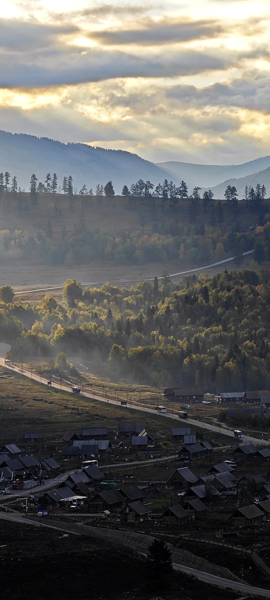 在新疆禾木村的清晨,朝阳穿透云层,为山林镀上金边。错落的木屋在晨雾中若隐若现,蜿蜒的道路穿梭于黄绿相间的林海间,远山层叠如墨。这一刻,禾木的日出将北疆的秋意与静谧,凝成一幅绝美的田园诗画。