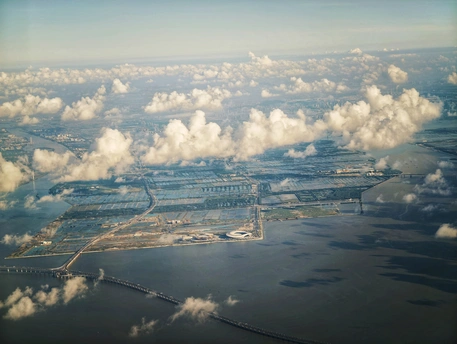 从云端俯瞰,城市与自然在此交融。云海如棉絮轻覆大地,跨海大桥似银练横亘碧波,滩涂与建筑错落成独特的肌理。这是天空视角下的城市诗篇,每一朵云、每一座桥,都在诉说着这片土地的蓬勃与诗意。