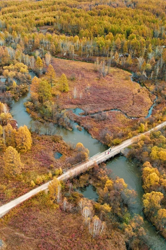 秋意泼墨山林,河流蜿蜒于斑斓草木间。一座小桥横跨清流,在这片被自然晕染的画卷里,秋的静美与灵动,都藏进了层林尽染的秘境之中。