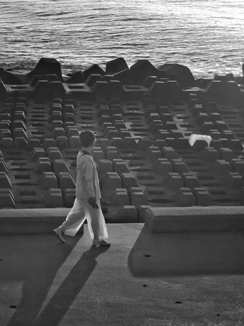 清晨,一个人独自在海边防波堤上步行早炼。