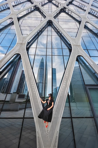 在充满几何韵律的框架里与镜面里的地标建筑对话。