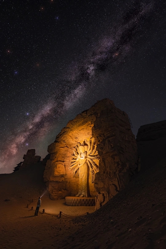 这幅作品取景于敦煌丝路遗产城,以千手观音造像为视觉核心,捕捉了大漠星空下的震撼画面。 画面中,璀璨银河如银带横贯苍穹,万千星子在深邃夜幕中闪烁;岩壁间的千手观音造像被暖光勾勒,细节庄重而神圣。渺小的人影手持光源,似在与古老造像、浩瀚星河对话,形成“人-艺-天”的三重呼应。