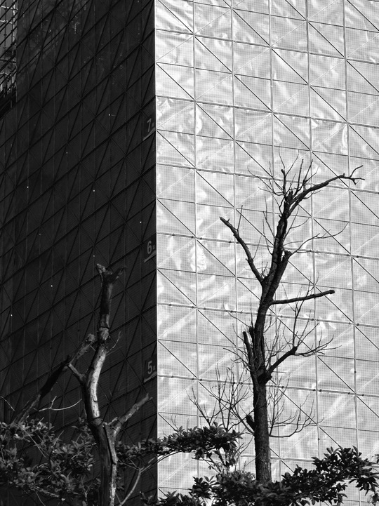 在光与影的交界,两个世界悄然对望。一边是被阳光轻抚的明亮天地,秩序井然的建筑表面闪耀着光芒,似在诉说着繁华与活力;另一边是隐于暗影的神秘之境,虽不见全貌,却透着沉静与未知。那光秃的枝干于明暗间伸展,仿佛是连接两个空间的使者,在时光里伫立,见证着这一明一暗的独特景致