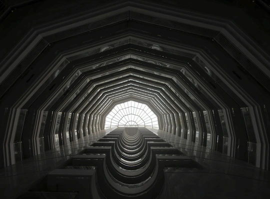 上海嘉汇国际广场,圆桶状建筑,从楼下中庭望上去,如通往天堂的隧道。