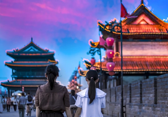 采用背影构图的方式,展现了两位人物手牵手前行的画面,给人一种故事感和情感的传递 。人物位于画面下方,古建筑占据上方部分,形成了一种前景与背景的层次感,同时也突出了古建筑的宏伟与壮观。