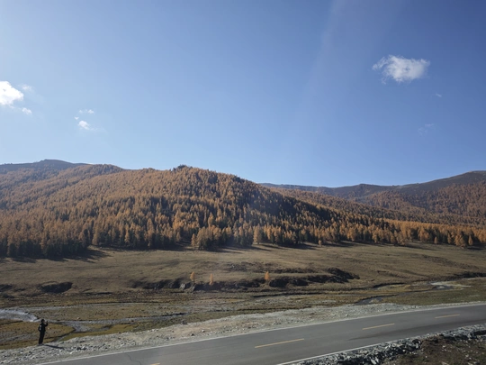 山行秋韵 远山如浪,林叶泼洒金芒, 秋阳轻晃,在路面织就光的网。 旷野铺展,似大地袒露的胸膛, 一条路,向着天际静静延长。 人立旁侧,成这画卷里, 渺小却鲜活的诗行, 与风同享,这秋山独有的, 澄澈与旷朗。