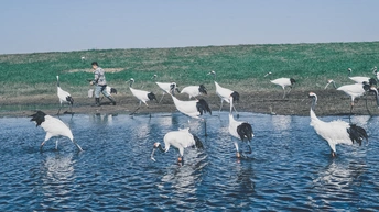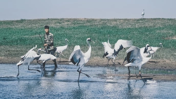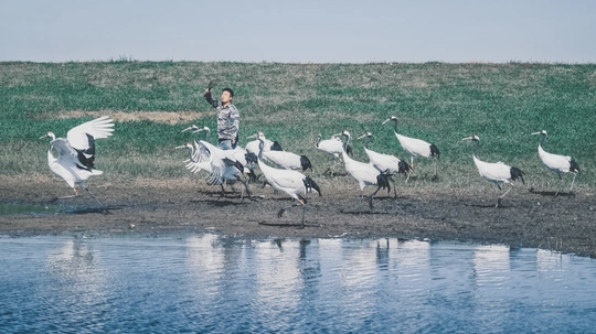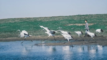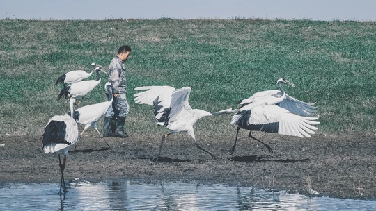 在这片水草丰美的湿地里,护鹤人一挥手,成群的丹顶鹤就从草地、从水面飞起,红白黑相间的羽毛在蓝天底下特别出挑~它们有时候慢悠悠踱步,有时候又突然振翅,活泼又优雅的样子真的把我治愈到了✨ 听当地人说,这些鹤都是被精心守护着的,护鹤人和它们之间的互动好有爱,就像一群大朋友带着一群“仙鹤宝宝”玩耍~ 来这里不仅能看到丹顶鹤的灵动身姿,还能感受到人与自然那种共生的温柔。随便拍一张都是电影感大片,推荐给所有喜欢自然、喜欢动物的姐妹,来扎龙赴一场和丹顶鹤的约会吧! 📍地点:扎龙国家级自然保护区 ⏰建议游玩时间:半天 📸拍照tips:穿浅色系衣服更出片,注意别惊扰到鹤哦~