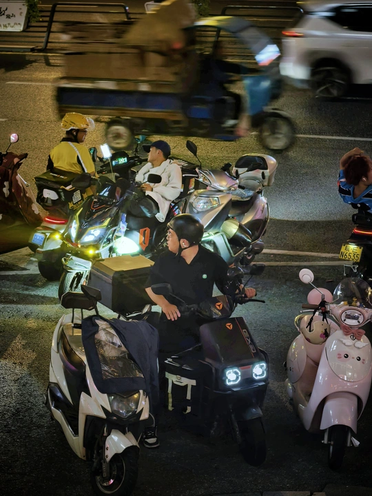 #祎璠纪实# #手机365-3250# 夜色里的街头,电动车的灯影交织成生活的脉络。快递小哥有奔波的忙碌,有等待的片刻歇息,每一辆车都载着不同的故事。