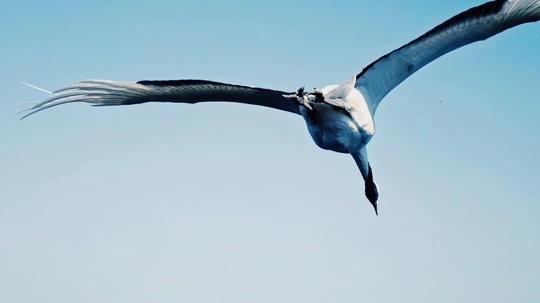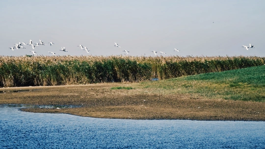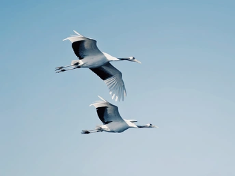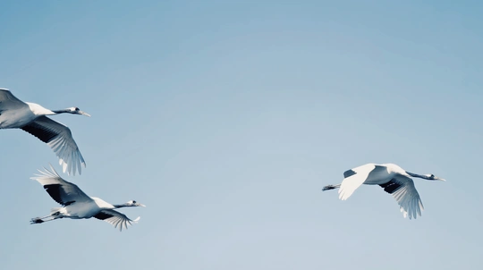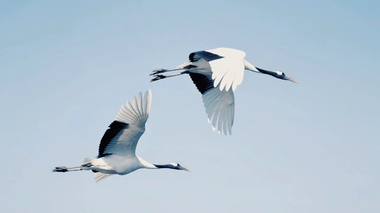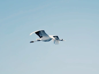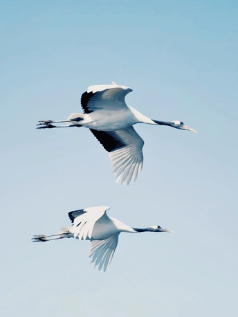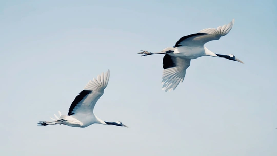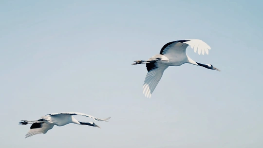 在蓝天的画布上,丹顶鹤舒展羽翼,或孤飞、或群翔,于湿地苇丛旁勾勒出灵动的弧线,每一次振翅都是自然写就的优雅诗行,将自由与生机定格在天地之间。