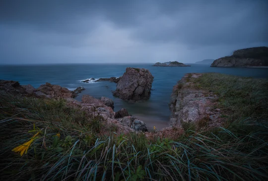 一场雨刚停,低云压海。西草垛子的岩礁围出一弯静水,中央巨石如船首指向外海。长时间曝光让海面柔滑成蓝灰色丝绸,眼前的野草与一抹黄色小花在沉静的色调中跳跃。远处岛影与岬角隐入薄雾,呈现出雨后清冷而广阔的海岸氛围。