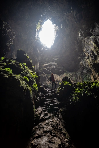 在黑暗的溶洞深处,一束天光如神明的馈赠倾泻而下。探险者的身影在光影间穿梭,每一步都踏在亿万年时光雕琢的石径上。这里是地下的秘境,是自然书写的传奇,每一寸岩壁都藏着岁月的低语,每一缕微光都指引着探索的热忱——在未知的洞穴里,我们既是访客,也是自然奇迹的见证者。