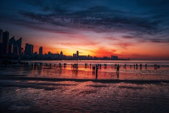 在青岛的海边,邂逅了一场绝美的朝霞,远处的城市天际线,勾勒出神仙画面,当霞光铺满整个海滩,每一帧都是治愈系大片!
